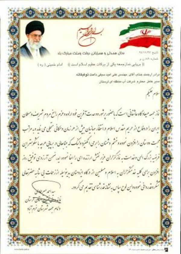 به گزارش روابط عمومی شرکت آب منطقه ای لرستان متن حکم نماینده ولی فقیه به این شرح است : نماز جمعه میعادگاه عاشقانی است که با حضور پرشور و وحدت آفرین خود اراده و عزم راسخ مردم شریف و مسلمان ایران را در دفاع از حریم مقدس اسلام در انتظار جهانیان بیش از هر زمان و مکانی متجلی می نماید و به مراتب محبت دوستان را افزون نموده و خشم دشمنان را برمی انگیزد و اینک که جنابعالی در برپایی هرچه باشکوهتر این فرضیه بزرگ الهی و خدمت به نمازگزاران عزیز نقش ارزنده ای را ایفا نموده اید ، ضمن آرزوی توفیق روز افزون برای کلیه خدمتگزاران به اسلام و مسلمین از درگاه ایزد منان بدینوسیله از زحمات بی شائبه حضرتعالی تشکر و قدردانی نموده و این لوح سپاس به نشانه قدرشناسی تقدیم می گردد